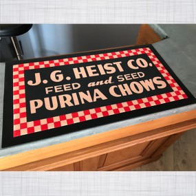 Tapis de comptoir Heist Feed and Seed. En caoutchouc noir antidérapant, surface imprimée en polyester lavable. Idéal pour la décoration de votre bar, comptoir, table, plan de travail...